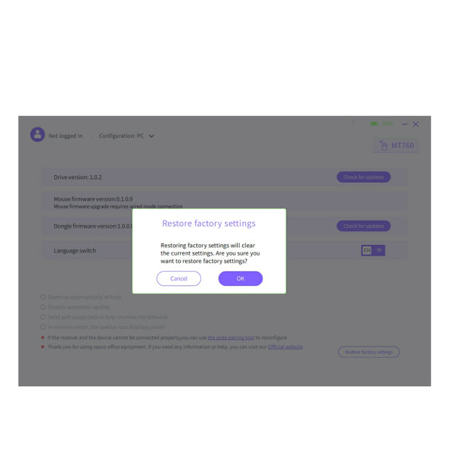 Select [Restore factory settings] to clear all your settings and reset the mouse to default factory settings.