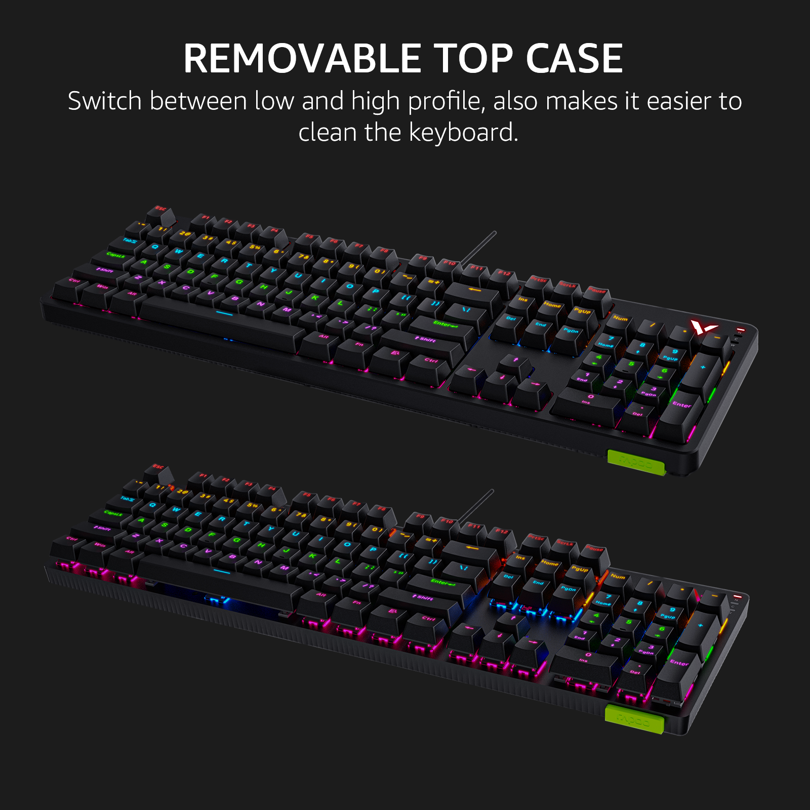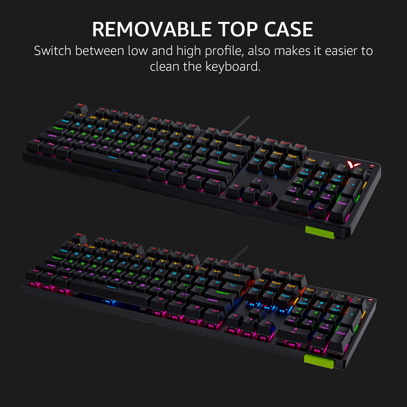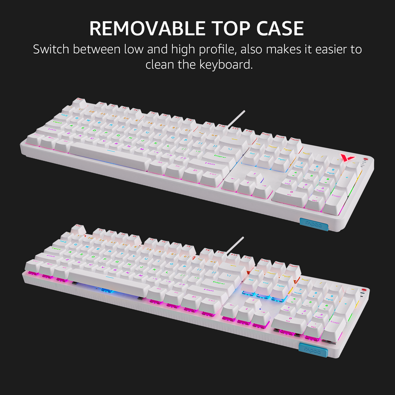 - Profil haut/bas commutable : doté d'un boîtier supérieur amovible, le V500Pro prend en charge le format coulant (profil bas) qui a des touches et un bruit plus faibles pour une saisie productive, et le format flottant (profil haut) qui a une course de commutation plus longue pour des clics de jeu nets.