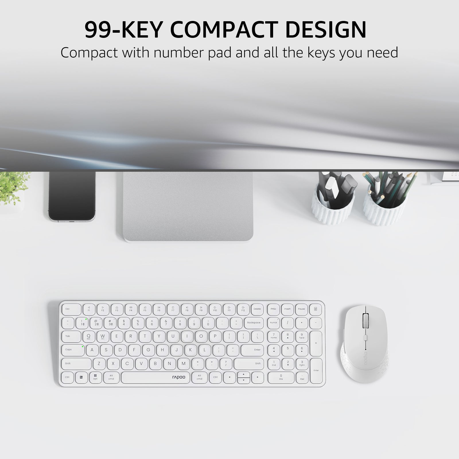 • Compact Wireless Combo: Featuring a 99-key layout with number pad and arrow keys, a silent mouse with side buttons - enhancing your typing and browsing efficiency yet taking 20% less space.