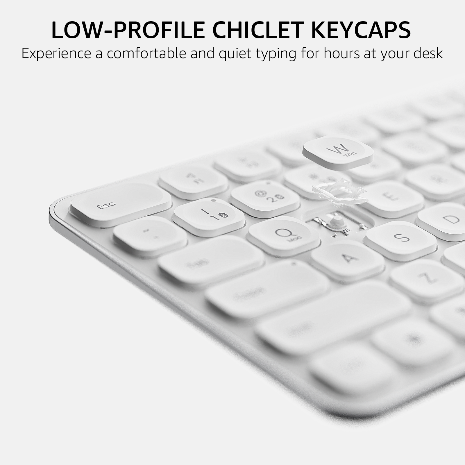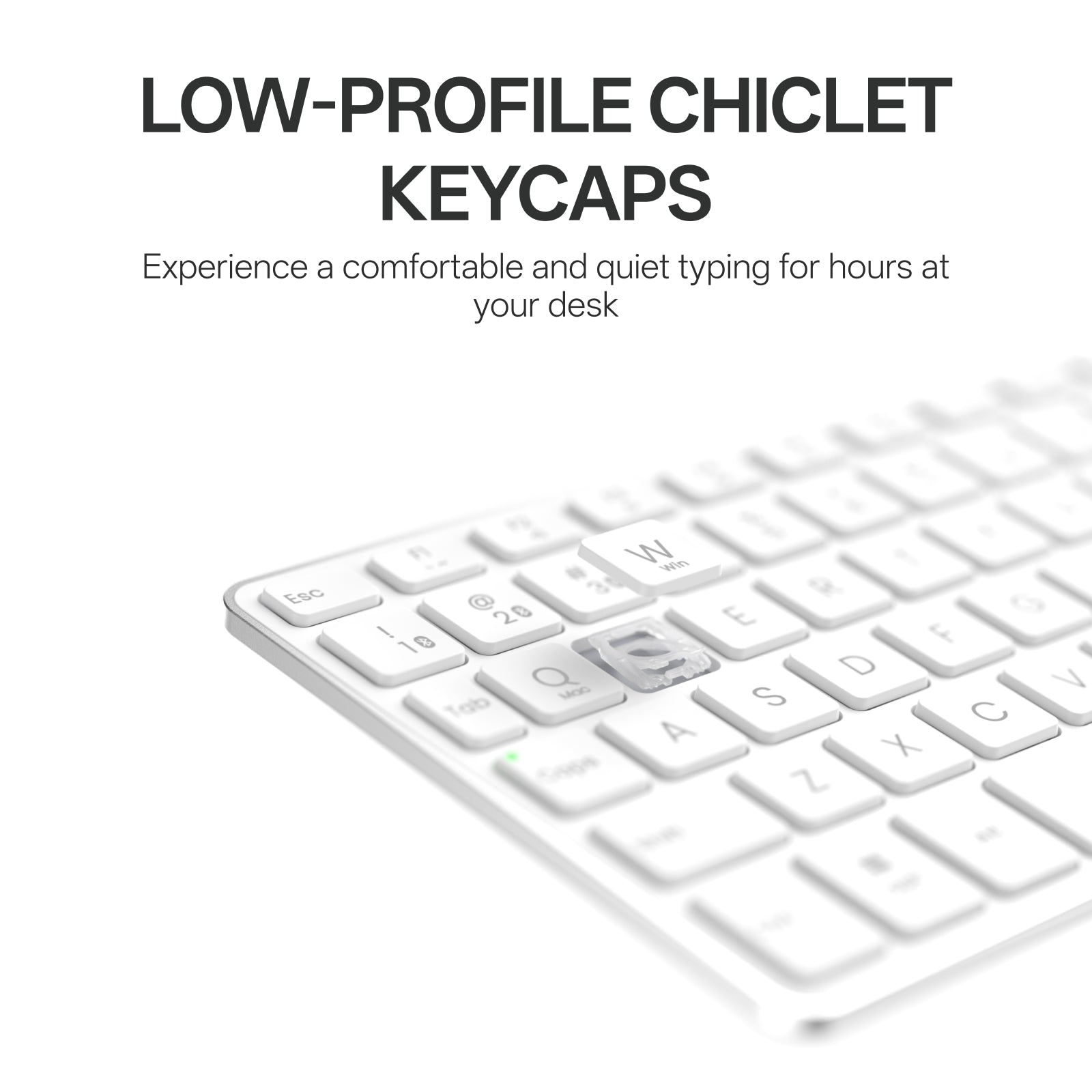 I’ve been using it for a while now, and I’ve got to say, I’m really impressed by how well it performs, especially for a keyboard that’s so thin. The ultra-slim design might be the first thing that stands out, and it really makes a difference when you're short on desk space or looking for something sleek to complement your setup. The fact that it’s made with an aluminum alloy frame adds to the overall feeling of durability, making it feel premium without being too heavy. Another thing I was initially skeptical about was its quietness—sometimes, low-profile keys are either too mushy or too loud, but that’s not the case here. The keys are responsive and satisfyingly quiet, making it ideal for late-night typing sessions or if you're in a shared workspace. The low-profile keys also mean less travel, which takes a bit of getting used to if you’re accustomed to deeper key presses, but I’ve found that I actually prefer it now. I’ve used it to type up reports, casual emails, and even play around with some coding, and it’s performed well across the board. Now, when it comes to connecting multiple devices, this feature is really what makes it stand out. I’m able to switch between my laptop, tablet, and even my phone with the press of a button, and it takes less than a second for each transition. I mostly use it with my Windows laptop, but it works flawlessly on my Android phone and my Mac, which is a nice touch if you’re someone who works across different platforms. Charging it with the USB-C port is a breeze; I don’t need to worry about finding the right cable or any fiddling. The rechargeable battery is a bonus too, as it holds up well and lasts me a good few days of moderate use before needing a charge, so it’s not something you’ll constantly be plugging in. The only small downside I’ve noticed is that it might take a bit longer to get used to if you're used to a more traditional keyboard layout with bigger keys, especially for those who do a lot of typing and are used to tactile feedback. However, once you adjust to the thinner keys, you’ll be able to type just as fast and accurately. One thing that I think could be improved is the spacing between some of the keys—while it’s definitely more compact, there are moments when my fingers don’t land exactly where I want them, especially for the shift or enter keys. This hasn’t been a major issue for me, but it might take a bit of time to adjust for others. Another thing worth mentioning is its design. I appreciate how clean and minimalist it looks, which isn’t always the case with keyboards that have a lot of extra features. The brushed aluminum surface gives it a high-end feel, and it doesn’t look out of place in any setting, whether it’s at home or in a professional office. If you’re someone who types a lot and values comfort, it might take a few days to get used to the feel of the keys, but it shouldn’t be a dealbreaker. I would recommend it to anyone who needs a multi-device keyboard that looks good, works seamlessly across various platforms, and provides a comfortable, quiet typing experience. It’s been a solid addition to my setup, and the benefits far outweigh the few small drawbacks it might have.