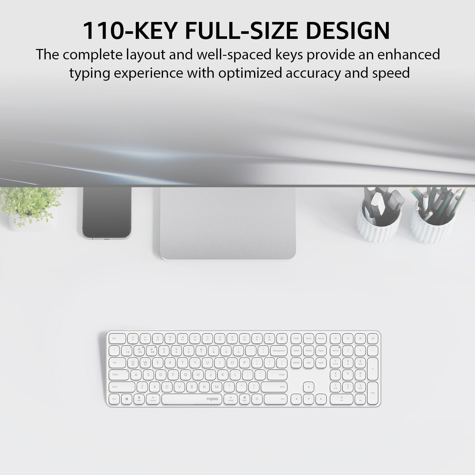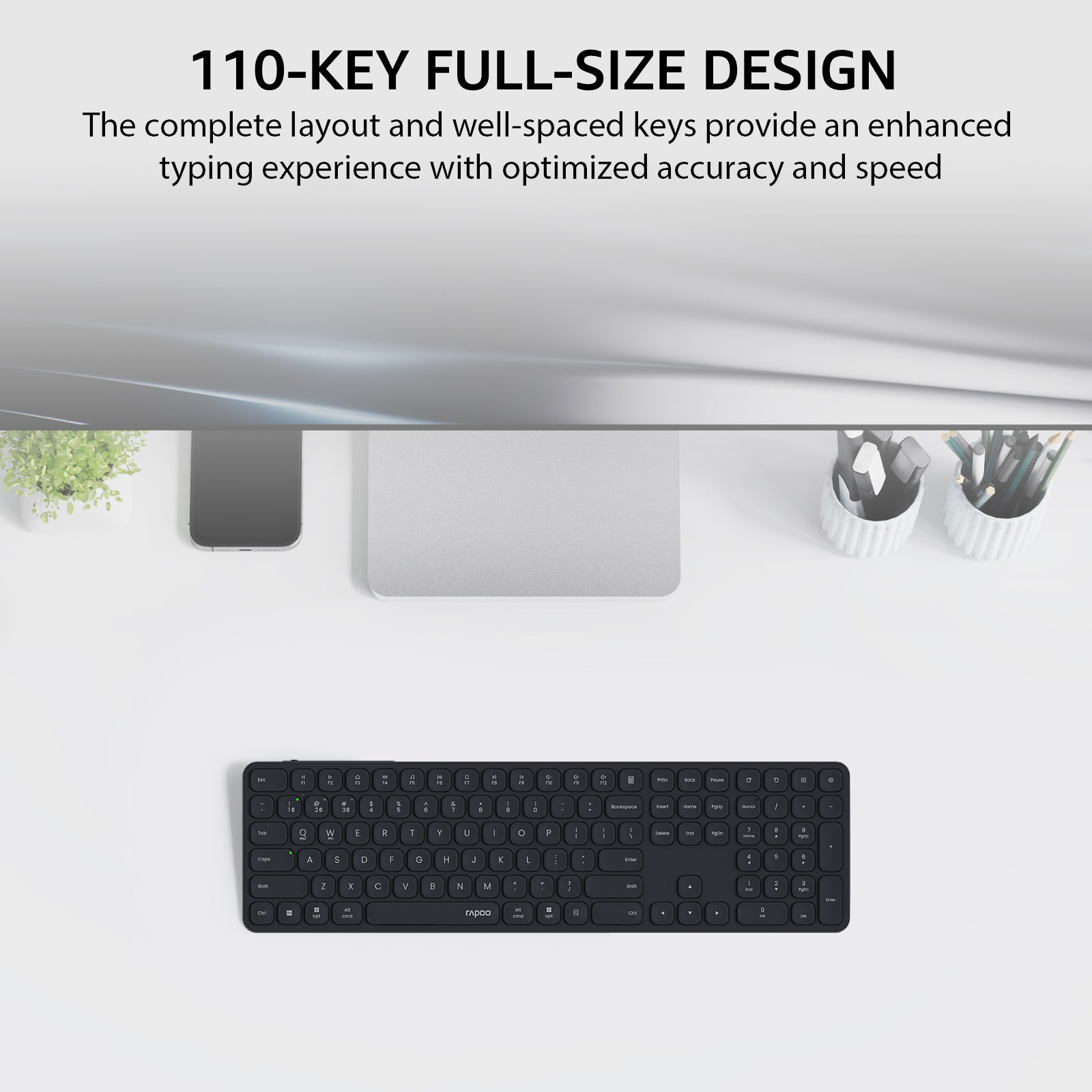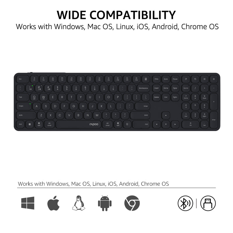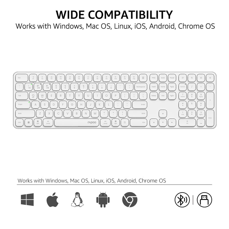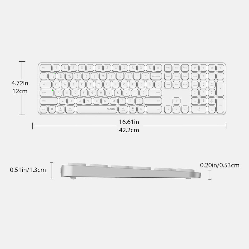 • Quiet and Comfortable: Featuring RAPOO’s classic blade-series ultra-thin design, E9550L delivers a fluid, precise and quiet typing experience at a natural angle for your wrist --- thanks to its 0.2-inch thickness that contributes less wrist strain, making extra palm rest no longer needed.