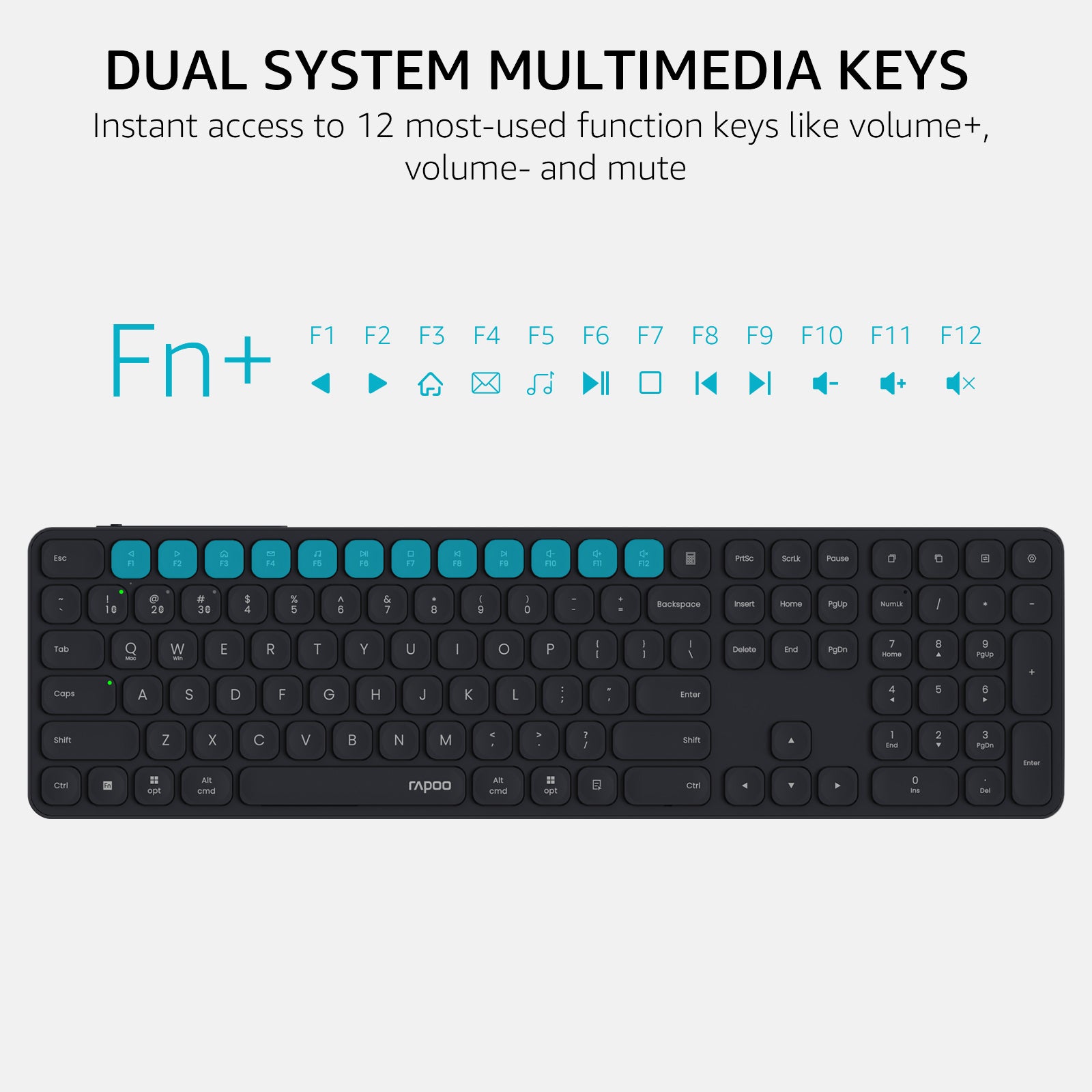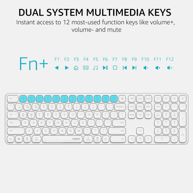 • 110-Key Complete Layout: A standard keyboard with number pad and all the keys you need, the well-spaced chiclet keys deliver fast fluid laptop-like typing, the 12 multimedia hotkeys provide quick access to most widely used functions such as play/pause, volume +/-, email --- Windows and Mac OS dual-system supported.