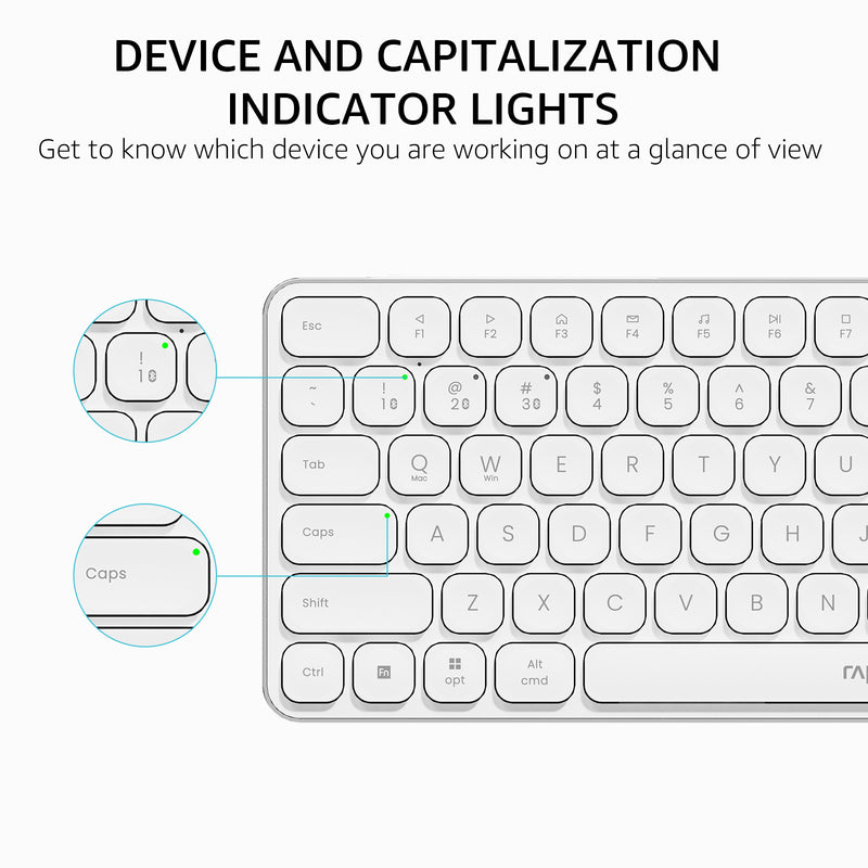 • Refined Details from Customer Voice: The latest version has added device and capitalization indicator lights for making it easier to find which device you are typing on, and eliminating the inconvenience caused by not knowing the uppercase or lowercase; What’s more, we’ve also added a battery indicator for better power management.