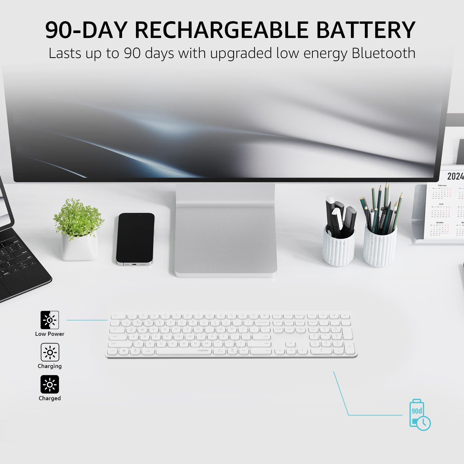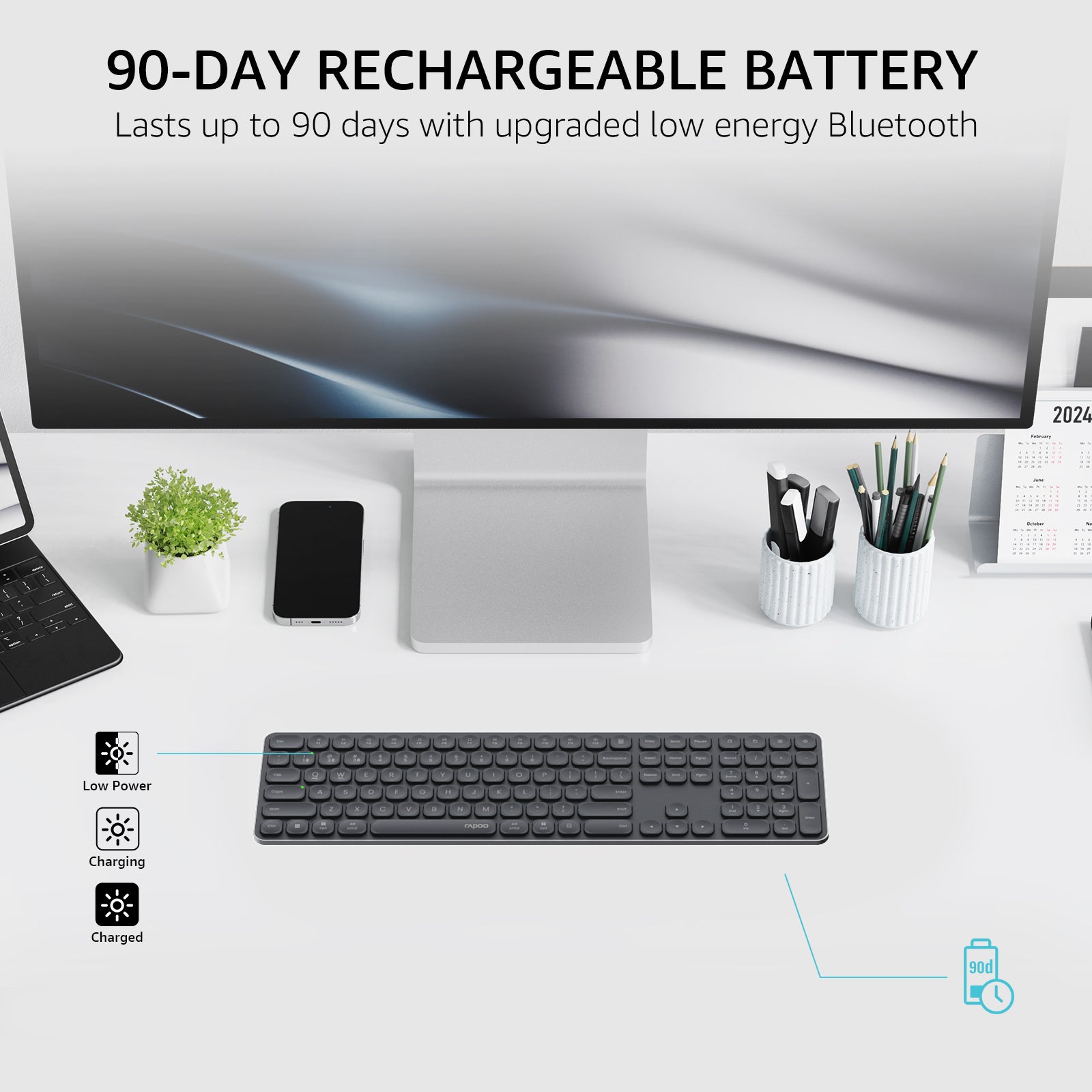 • Rechargeable with 90-Day Battery Life: Upgraded with our latest low-power technology, the E9550L wireless keyboard can run up to 90 days on a full charge. In addition, the USB-C supports a whole day use on a 10-minute fast charging.